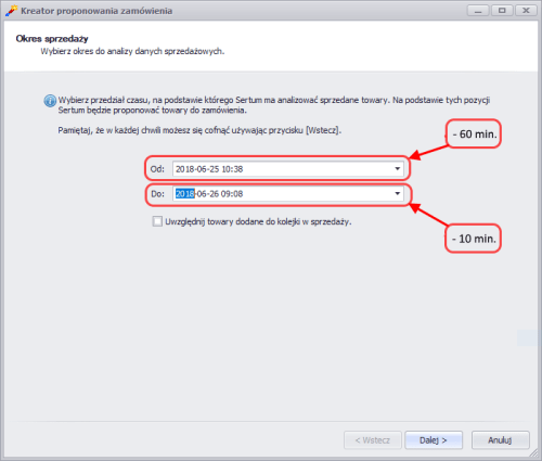 Od: wstecz o 60 minut (od daty i godziny ostatnio wysłanego zamówienia); czas został cofnięty, aby Kreator uwzględnił w analizie towary, które sprzedały się w czasie przygotowywania poprzedniego zamówienia.