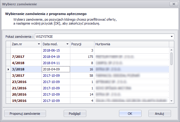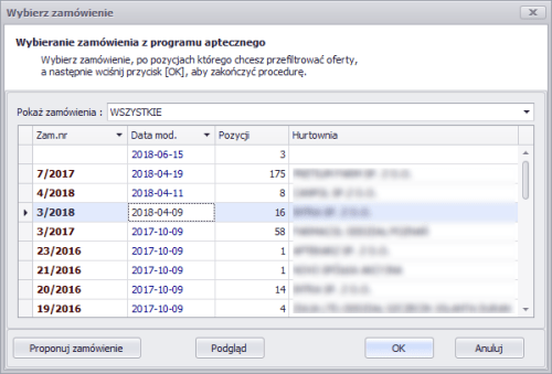 - Ujednolicono sortowanie zamówień zaczytywanych z programu aptecznego (dla pracy na danych z Sertum i na danych bezpośrednio z bazy apteki). W oknie Wybierz zamówienie zamówienia są sortowane (malejąco) najpierw po dacie modyfikacji, następnie po numerze zamówienia, a na końcu po dacie utworzenia zamówienia (kolumna ukryta).