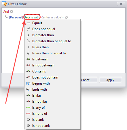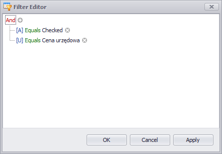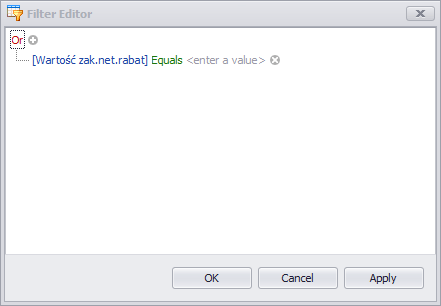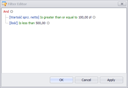 W raportach, które nie zawierają kolumn z wartościami Tekstowymi nie znajdują się wszystkie z powyżej wymienionych warunków (ilość warunków zależy od widoku w którym chcemy zastosować filtry).