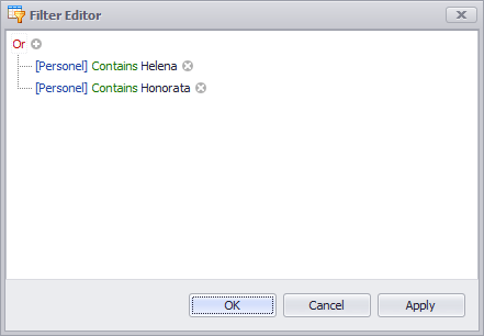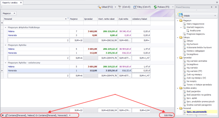 W raporcie Sprzedaż wg personelu chcemy zobaczyć sprzedaż osób, których imię zawiera imię Helena lub Honorata. W tym celu należy ustawić następujące filtry:
