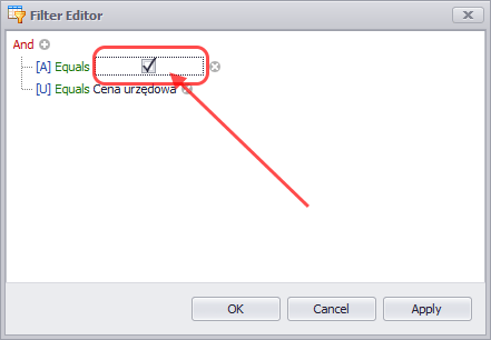 W polu <enter a value> należy wpisać określoną wartość tekstową lub numeryczną, lub zaznaczyć Chceckbox, jak na obrazku poniżej.