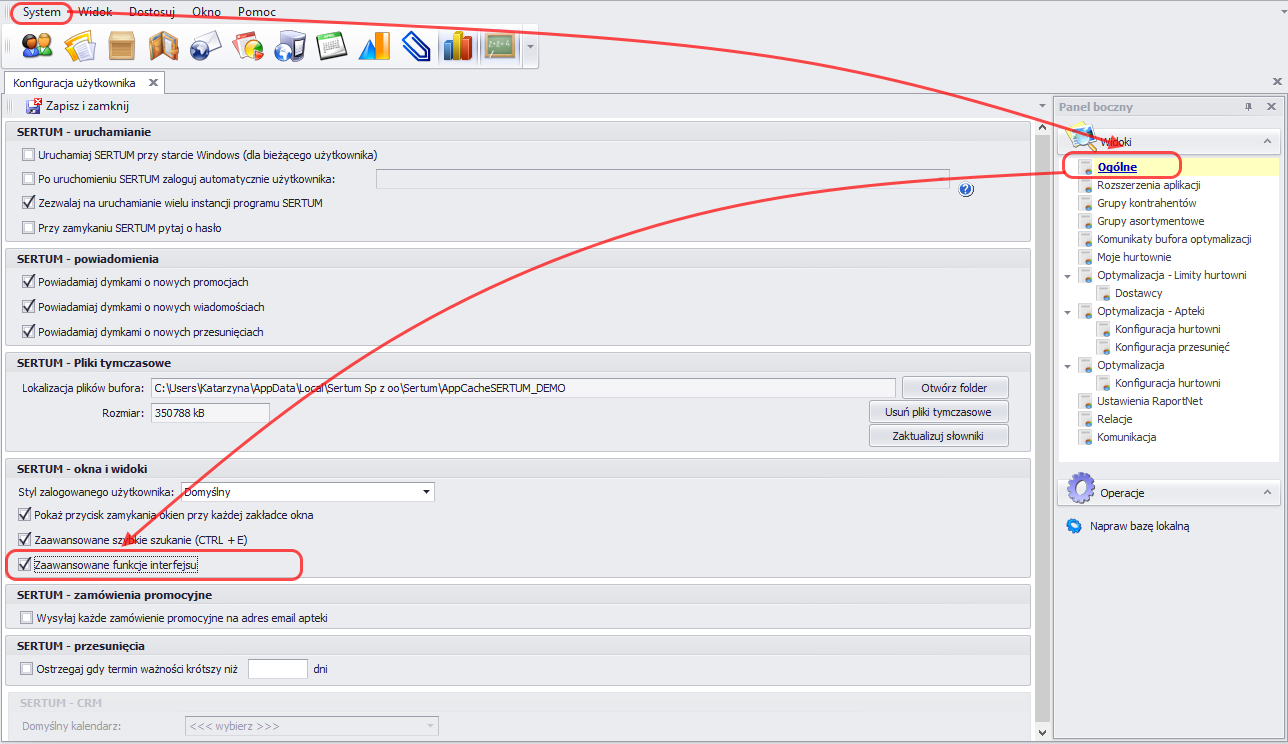 Aby mieć możliwość korzystania z zaawansowanych flitów na początku w konfiguracji aplikacji Sertum należy włączyć Zaawansowane funkcje interfejsu. W tym celu należy otworzyć System -> Konfiguracja -> widok Ogólne oraz w sekcji SERTUM – okna i widoki zaznaczyć opcje Zaawansowane funkcje interfejsu.