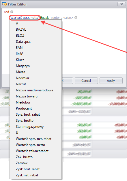 Po kliknięciu w Equals rozwinie się lista dostępnych wariantów, która umożliwi dowolne zawężenie wyświetlanych danych.