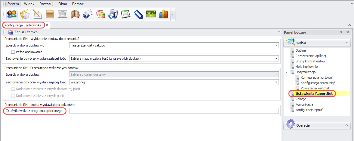 - Z poziomu apteki należy wejść w System -> Konfiguracja -> widok Ustawienia RaportNet