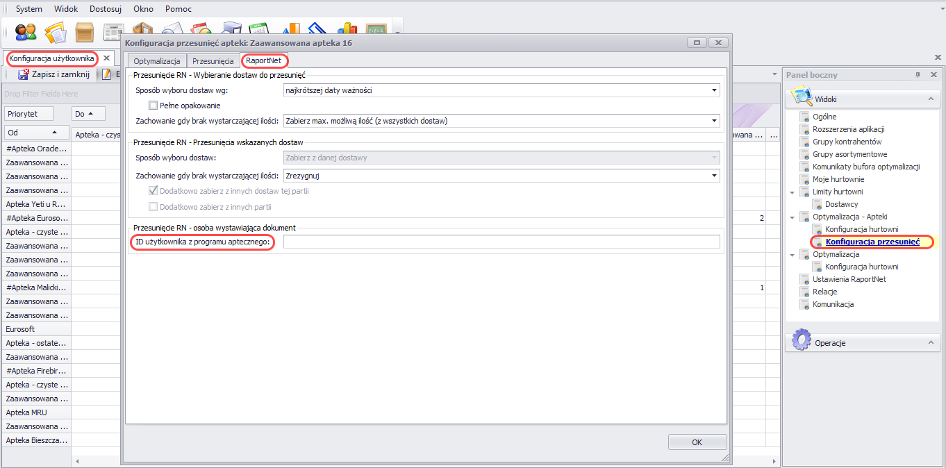 - Z poziomu menedżera należy wejść w System -> Konfiguracja ->widok Optymalizacja-Apteki -> podwidok Konfiguracja przesunięć
