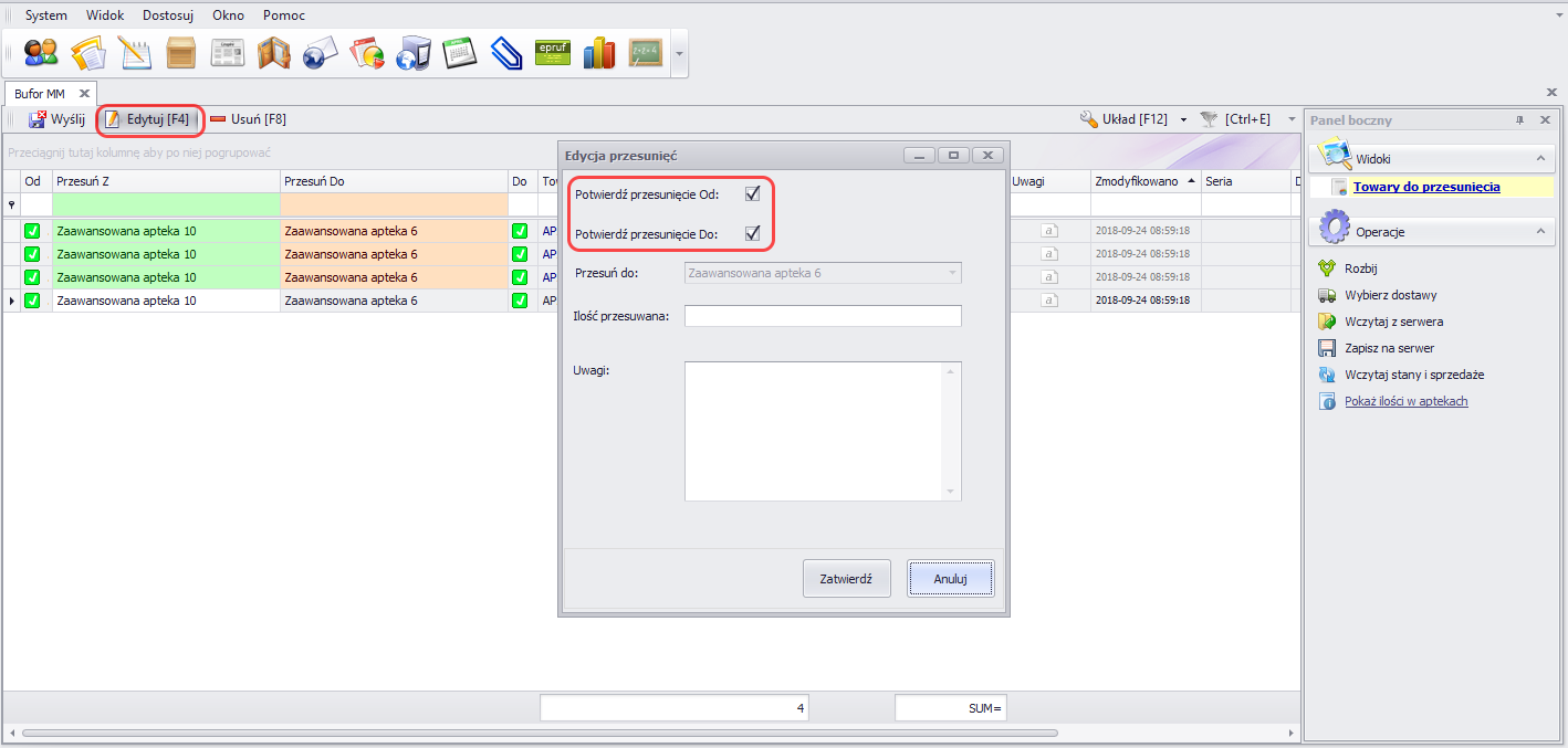 - W Buforze MM została udostępniona opcja multiedycji statusu pozycji Od i Do (dostępność zmiany statusu zależna jest od posiadanych przez użytkownika uprawnień). Po wskazniu pozycji, dla których chcemy zmienić status i kliknięciu Edytuj, w oknie Edycja przesunięć mamy możliwość zaznaczenia Potwierdź przesunięcie Od i Potwierdź przesunięcie Do.