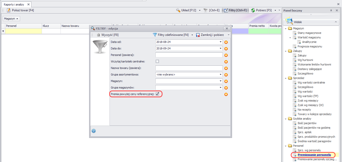 - W raporcie Premiowanie Personelu została udostępniona opcja naliczania premii do sprzedaży dokonanych po cenie referencyjnej i cenie wyższej od ceny referencyjnej. W celu naliczania premii do takich sprzedaży należy w Filtrach zaznaczyć checkbox przy opcji: Premia powyżej ceny referencyjnej.