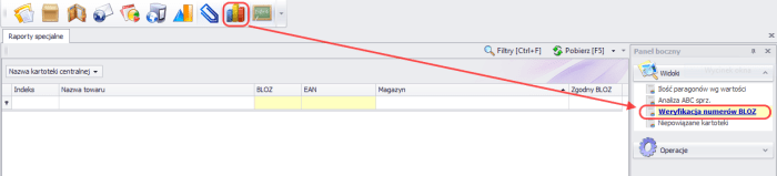 W ramach raportów specjalnych (moduł Raporty specjalne -> widok Weryfikacja numerów BLOZ) w aplikacji Sertum został udostępniony raport Weryfikacja numerów BLOZ.