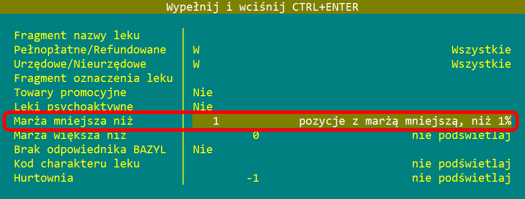 Do funkcji Podświetlenie warunkowe (Przychody, Stany, Asortyment) dodano dwa nowe parametry umożliwiające automatyczne podświetlenie leków z marżą zbyt niską oraz zbyt wysoką.