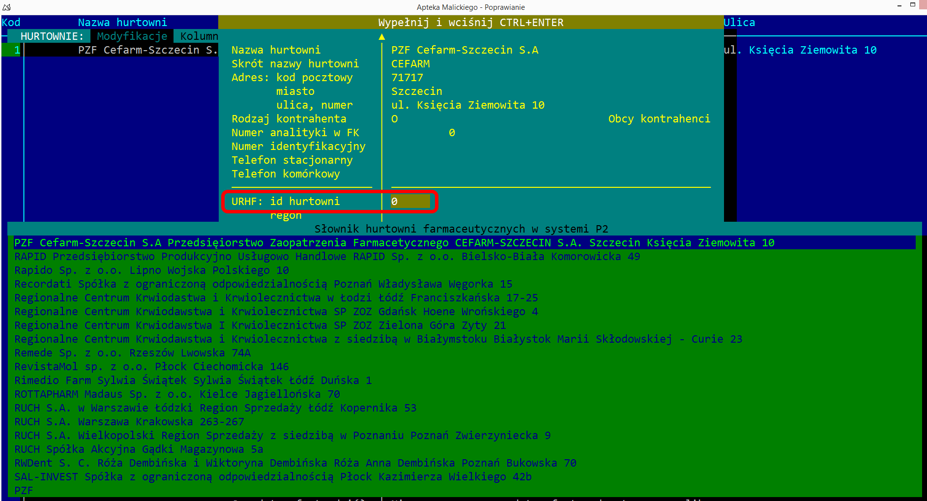 Oba pola powinny zostać wypełnione przy hurtowniach, z których Apteka nadal robi zakupy. Nie ma potrzeby usuwania starych, nieużywanych hurtowni ze Słownika hurtowni. Podczas wypełniania nowych pól można posiłkować się aktualnym Rejestrem Hurtowni Farmaceutycznych w Systemie P2: