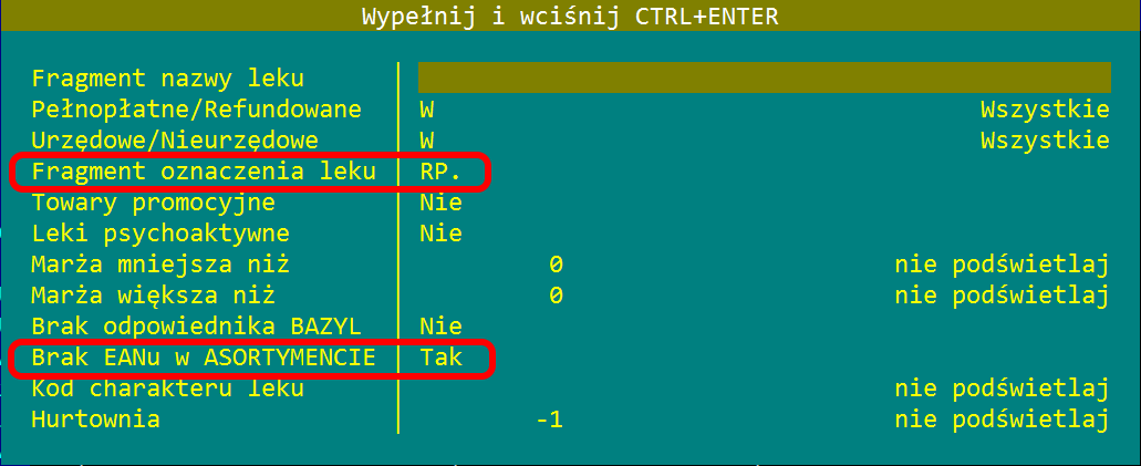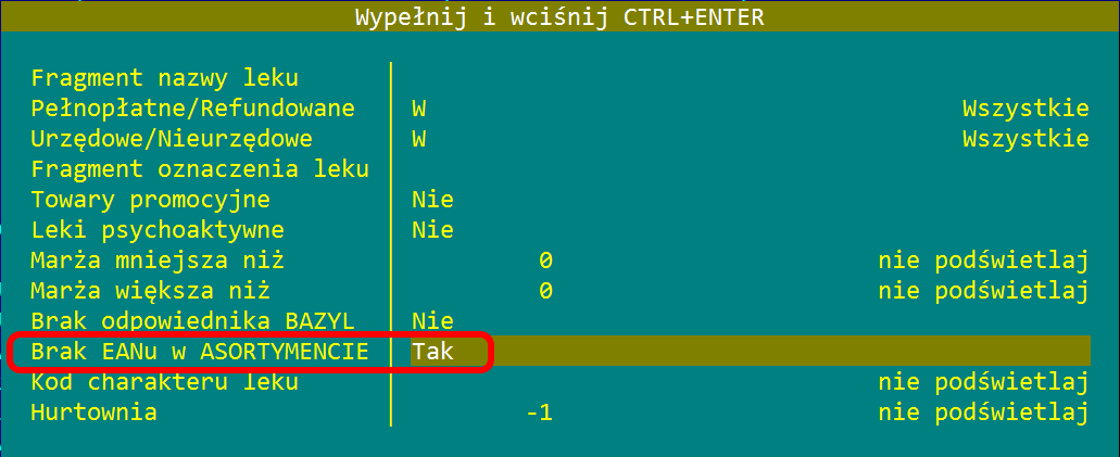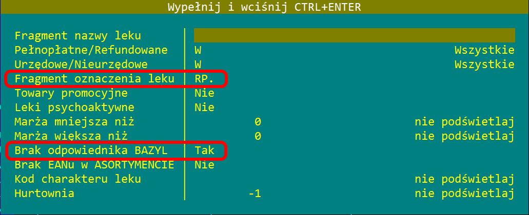 Aby szybko zlokalizować leki w Asortymencie, które nie posiadają odpowiednika w BAZYLu, należy w funkcji Wydruki -> Podświetlenie warunkowe wypełnić następujące pola:
