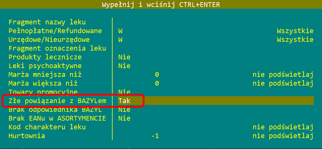 W Asortymencie i w Stanach, do funkcji Wydruki -> Podświetlenie warunkowe, dodano parametr o nazwie Złe powiązanie z BAZYLem. Nowy parametr powoduje podświetlenie tych kart asortymentowych, które mogą mieć niezgodne powiązanie z BAZYLem. Podczas wyszukiwania podejrzanych powiązań, algorytm dokonuje analizy różnic nazwy leku w Asortymencie z nazwą w BAZYLu.