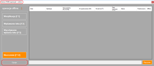 Weryfikacja towarów odbywa się automatycznie podczas sprzedaży po zeskanowaniu kodu 2D. W celu wydania leku (wycofania kodu z NMVS) należy wywołać okno operacji przez wybranie na klawiaturze kombinacji klawiszy Ctrl+Q (domyślnie okno otwiera się w trybie wydawania leków).
