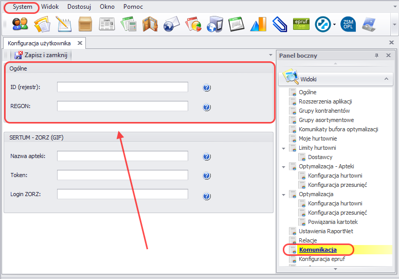 W tym celu należy wejść w System-> Konfiguracja -> widok Komunikacja i uzupełnić REGON oraz ID(rejestr). Całość operacji potwierdzamy przyciskiem