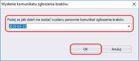 Po użyciu operacji Wyślij ponownie zostanie wyświetlone okno, gdzie należy wskazać za jaki dzień chcemy ponownie wysłać komunikat zgłoszenia braków.