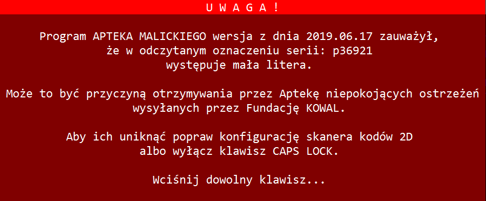 Podczas odczytu kodu 2D (FMD) w ekspedycji, dodano automatyczne rozpoznanie przypadku, który może powodować wysyłanie przez Fundację KOWAL niepokojących ostrzeżeń dotyczących zmiany wielkości liter z wielkich na małe w oznaczeniu serii leki lub numerze seryjnym.