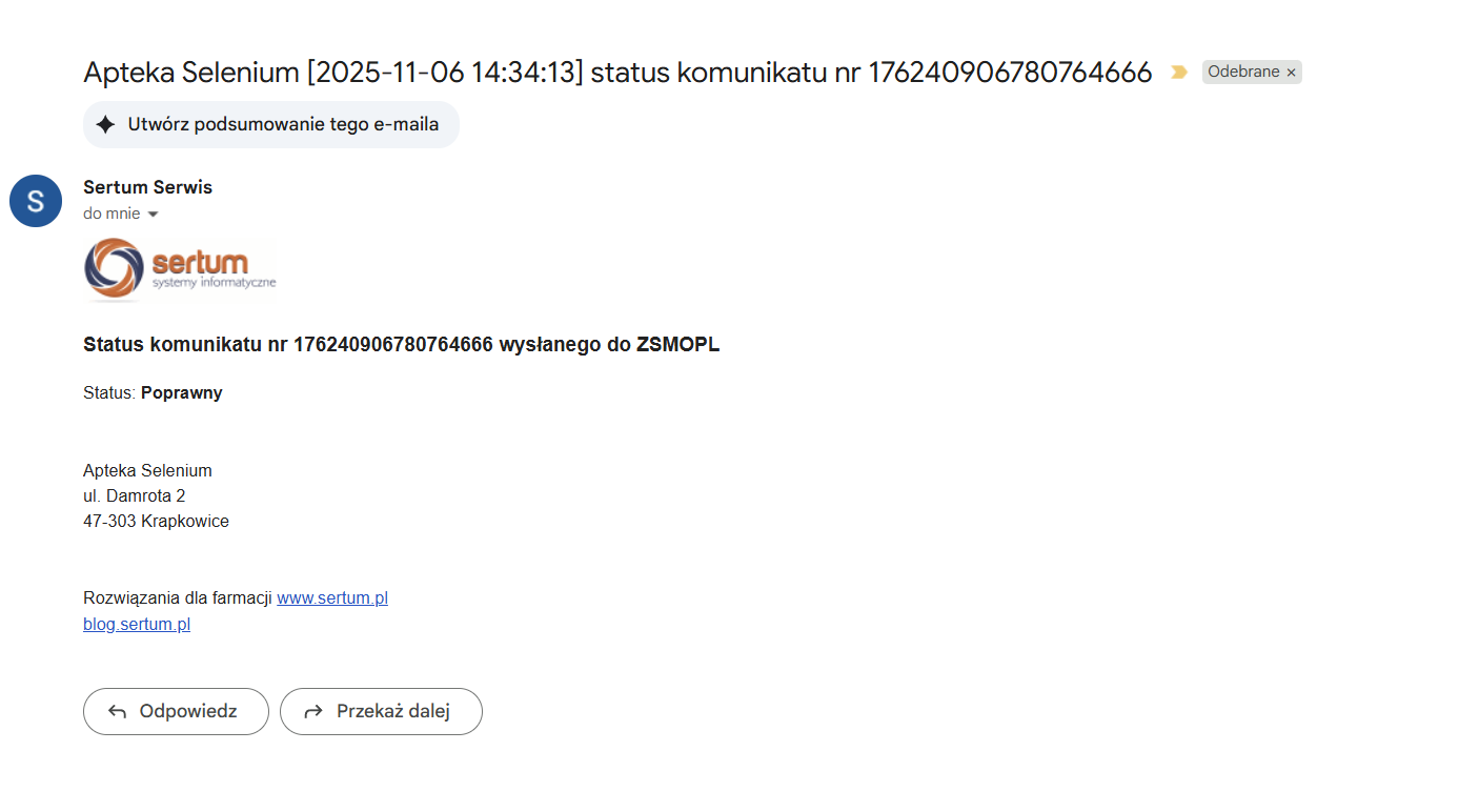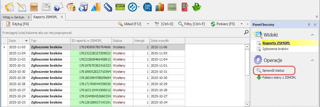 Wszystkie apteki, które wysłały do Sertum odpowiedni formularz oraz skonfigurowały aplikacje zgodnie z wpisem umieszczonym na naszym Blogu: https://blog.sertum.pl/2019/04/11/przypominamy-jak-prawidlowo-skonfigurowac-modul-zmsopl/ mają możliwość sprawdzenia w aplikacji Sertum, jakie dane zostały zaraportowane do ZSMOPL.