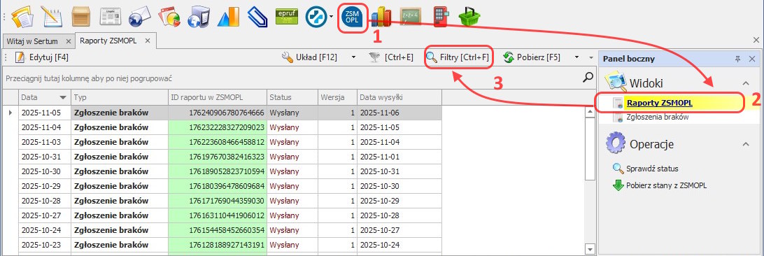 Aby to zrobić należy otworzyć moduł ZSMOPL , wtedy automatycznie otwiera się widok Raporty ZSMOPL. Domyślnie widok ten pobiera dane z ostatnich 30 dni. Aby sprawdzić wysyłkę danych z innego okresu czasu należy posłużyć się przyciskiem Filtry [Ctrl+F] i w filtrach „Data Od:” należy wskazać wybraną datę.