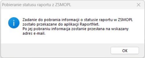 Po użyciu operacji wyświetlane jest okienko, w którym należy podać adres e-mail, na który ma zostać wysłana informacja o statusie raportu w ZSMOPL.