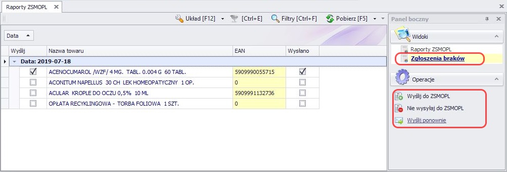 • Wyślij do ZSMOPL – ustawia kolumnę Wyślij jako zaznaczoną, nie oznacza to, że pozycja została już zaraportowana, a jedynie, że jest oznaczona do wysyłki. Automatyczna wysyłka tych preparatów będzie miała miejsce, tylko i wyłączenie wtedy, kiedy użyjemy operacji w dniu bieżącym (czyli tego samego dnia, w którym preparaty pojawiły się na liście Zgłoszenia braków).