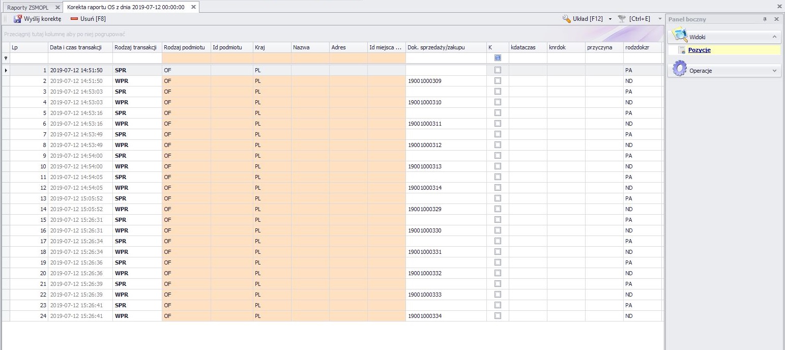 Po zaznaczeniu raportu, do którego chcemy wysłać korektę i skorzystaniu z operacji Edytuj otworzy się nam raport z wszystkimi przesłanymi w komunikacie transakcjami, wszystkie kolumny w nim są edytowalne. Jest tutaj również dostępna operacja Usuń [F8], która pozwala usunąć zaznaczony wiersz. Po skorygowaniu i/lub usunięciu wymaganych wierszy korzystamy z operacji Wyślij korektę, spowoduje to wysłanie korekty komunikatu i adekwatną zmianę statusu. Jeśli nie dokonaliśmy żadnych zmian i spróbujemy wysłać korektę wyświetli się komunikat „Nie dokonano zmian w raporcie. Raport nie zostanie przesłany do ZSMOPL.”