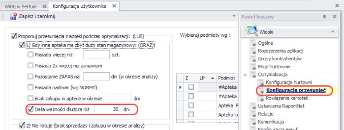 - Dodaliśmy nowy parametr w konfiguracji przesunięć: Data ważności dłuższa niż. Po ustawieniu parametru przesunięcia będą proponowane, podczas optymalizacji dziennej, tylko z tych aptek, które mają zbyt duży stan magazynowy i najkrótsza data ważności danego preparatu jest dłuższa niż wskazana ilość dni.