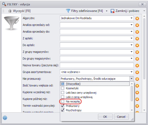 - Dodaliśmy w Optymalizacji magazynów filtr pozwalający wyłączyć z optymalizacji (i tym samym z przesunięć) pozycje sprzedawane na receptę. Zaznaczenie w Filtrach opcji Nie przesuwaj: Na receptę spowoduje, że do analizy nie będą brane preparaty, które są lekami sprzedawanymi wyłącznie na receptę (nie mogą być sprzedane odręcznie).