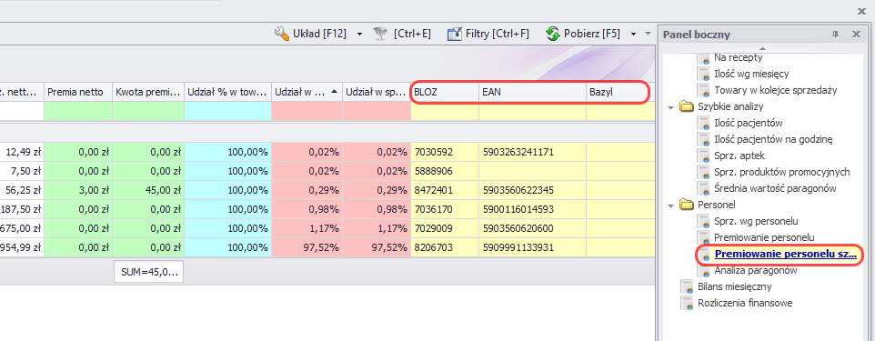 - W raporcie Premiowanie personelu szczegółowo dodaliśmy kolumny z numerami Bloz, EAN i Bazyl.