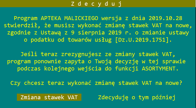 Dodano automatyczną zmianę stawki VAT z 8% na 23% dla surowców recepturowych, zgodnie z Ustawą z 9 sierpnia 2019 r. o zmianie ustawy o podatku od towarów i usług [Dz.U. 2019.1751]. Zmiana wykona się automatycznie po wejściu do Asortymentu Apteki 1 listopada 2019 r.