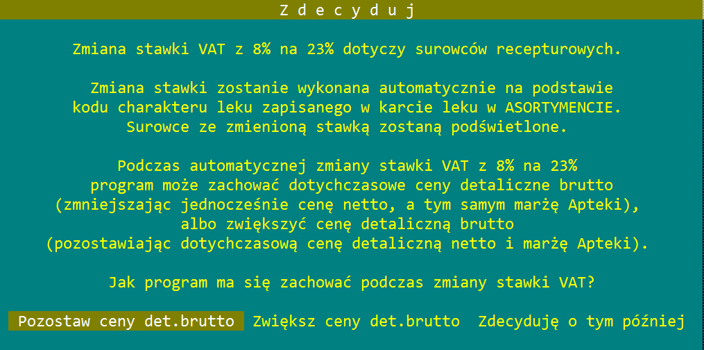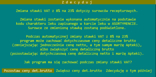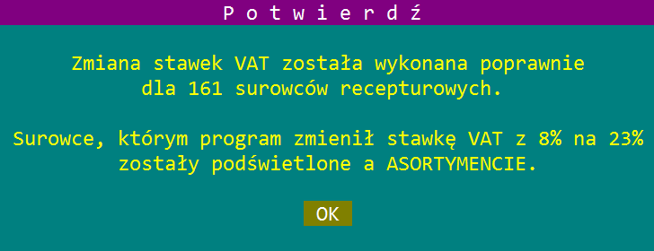 Tym niemniej w listopadzie mogą być wprowadzane zakupy surowców ze stawką 8%, jeśli faktura sprzedaży hurtowej została wystawiona jeszcze w październiku. W takim przypadku program zaproponuje przepisanie stawki 8% do ASORTYMENTU, ale nie należy korzystać w tej propozycji i trzeba pozostawić stawkę 23%.