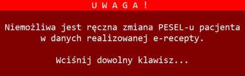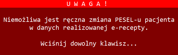 Usunięto bezpodstawnie pojawiające się ostrzeżenie dotyczące ręcznej zmiany PESEL-u pacjenta w danych recepty papierowej.