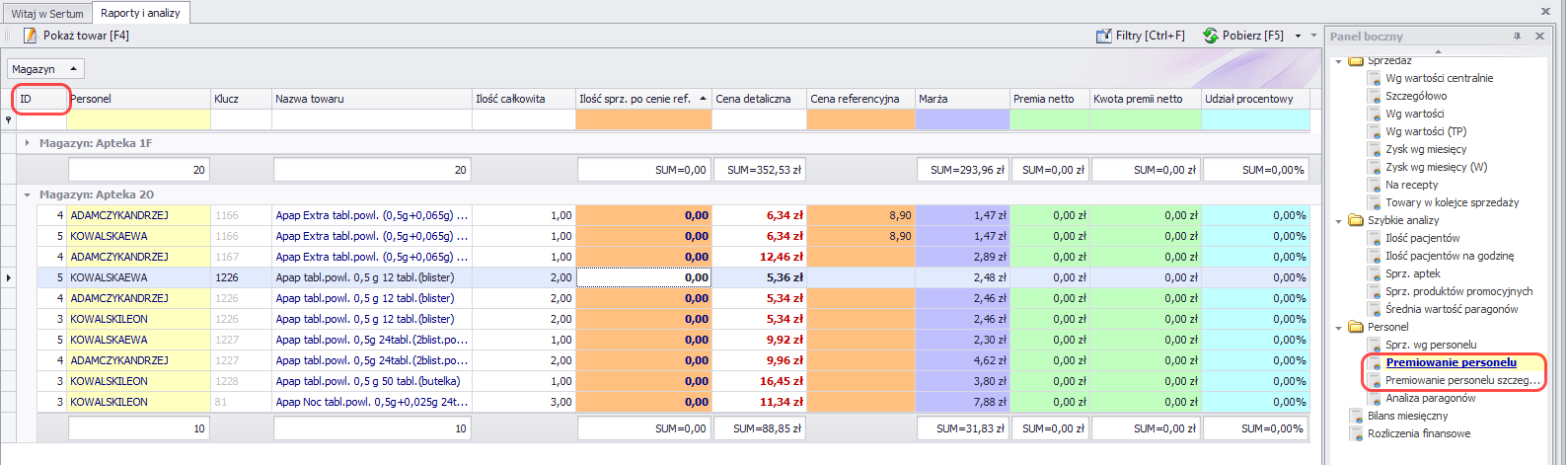 - W raportach Premiowanie personelu i Premiowanie personelu szczegółowo dodaliśmy możliwość umieszczenia na raporcie kolumny z identyfikatorem pracownika w programie aptecznym (informacja ta będzie dostępna w Sertum dla sprzedaży zaczytanych po aktualizacji).