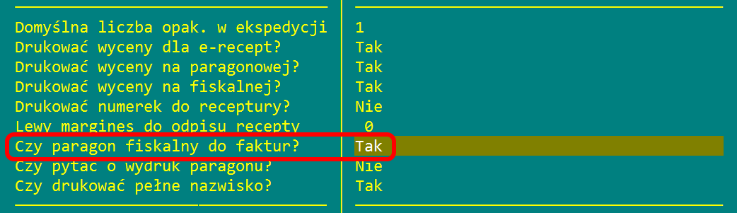 W Parametrach programu dodano parametr o nazwie Czy paragon fiskalny do faktur? Ustawienie wartości NIE spowoduje blokadę wydruku paragonów fiskalnych dla pacjenta, dla którego zaznaczono wydruk faktury bezpośrednio po zakończeniu ekspedycji.
