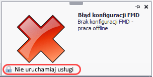 - Podczas logowania do Sertum (w aptekach korzystających z modułu FMD) jest sprawdzane połączenie z serwerem NMVS. W przypadku problemów z połączeniem wyświetli się teraz komunikat w postaci dymka w prawym dolnym rogu ekranu. Na wyświetlonym komunikacie będzie możliwość zaznaczenia opcji Nie uruchamiaj usługi. Spowoduje to wyłączenie usługi na tym komputerze.