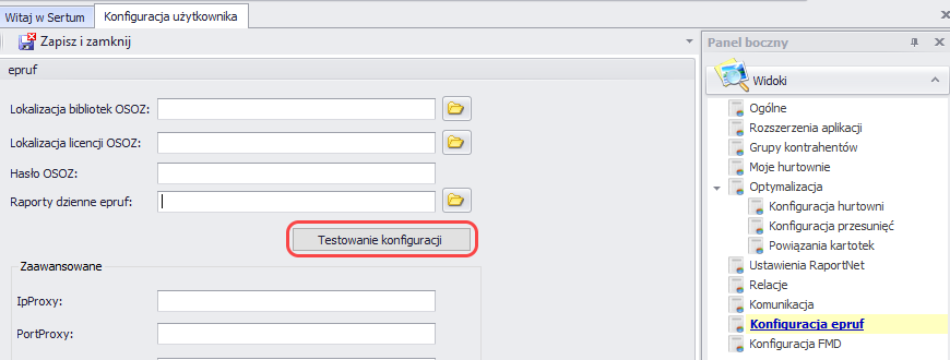 - Wprowadziliśmy także możliwość przetestowania konfiguracji dotyczącej komunikacji z serwerem epruf.