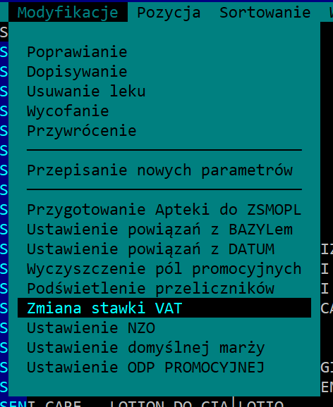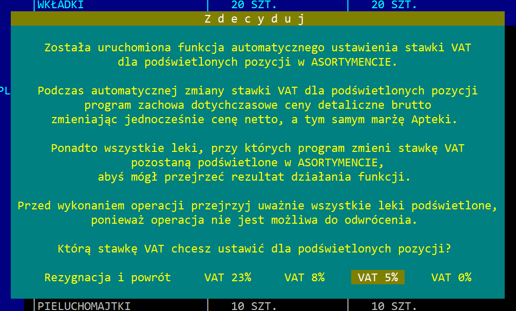 W związku z planowaną zmianą stawek VAT na środki pomocnicze przypominamy, że w funkcji Asortyment apteki > Modyfikacje > Zmiana stawki VAT można tę czynność wykonać automatycznie dla podświetlonych uprzednio pozycji w tabeli asortymentowej.