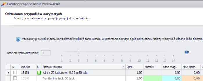 - Wraz z wydaniem tej wersji, menedżerowie sieci mają możliwość zablokowania aptekom zmiany ilości dni zatowarowania w Kreatorze proponowania zamówienia (suwak).