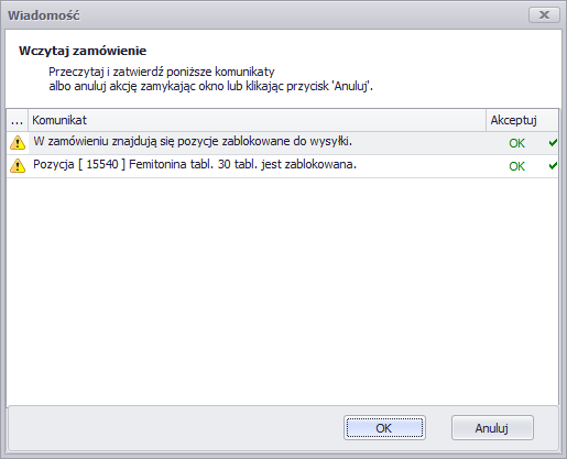 - Pozycje zablokowane komunikatem, z ilością do zamówienia większą od zera, dla których odznaczona zostanie blokada w Kreatorze proponowania zamówienia zostaną teraz dodane do bufora. Podczas dodawania do bufora pojawi się jedynie ostrzeżenie, że dodawane są pozycje zablokowane do zamówienia.