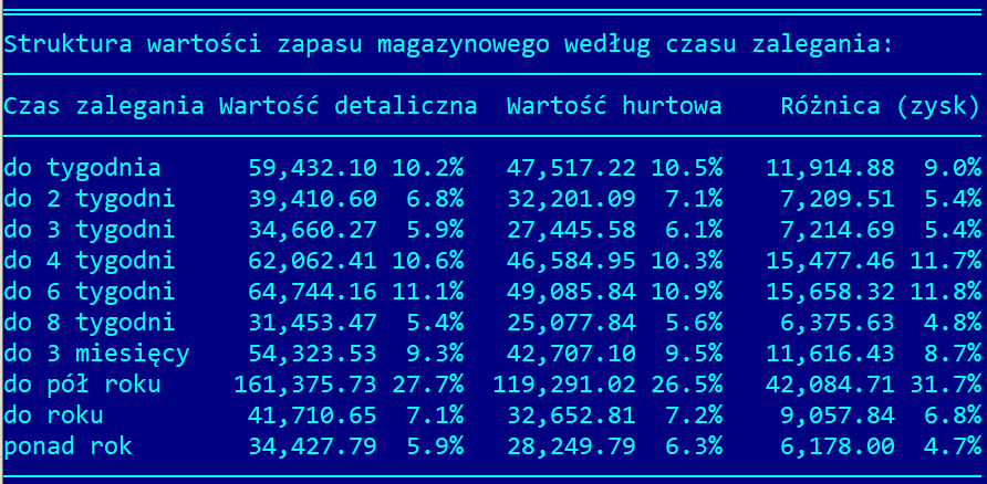 Do funkcji Przychody > Stany leków w aptece > Wydruki > Zapas magazynowy dodano strukturę wartości aktualnego zapasu magazynowego według czasu zalegania produktu w Aptece.