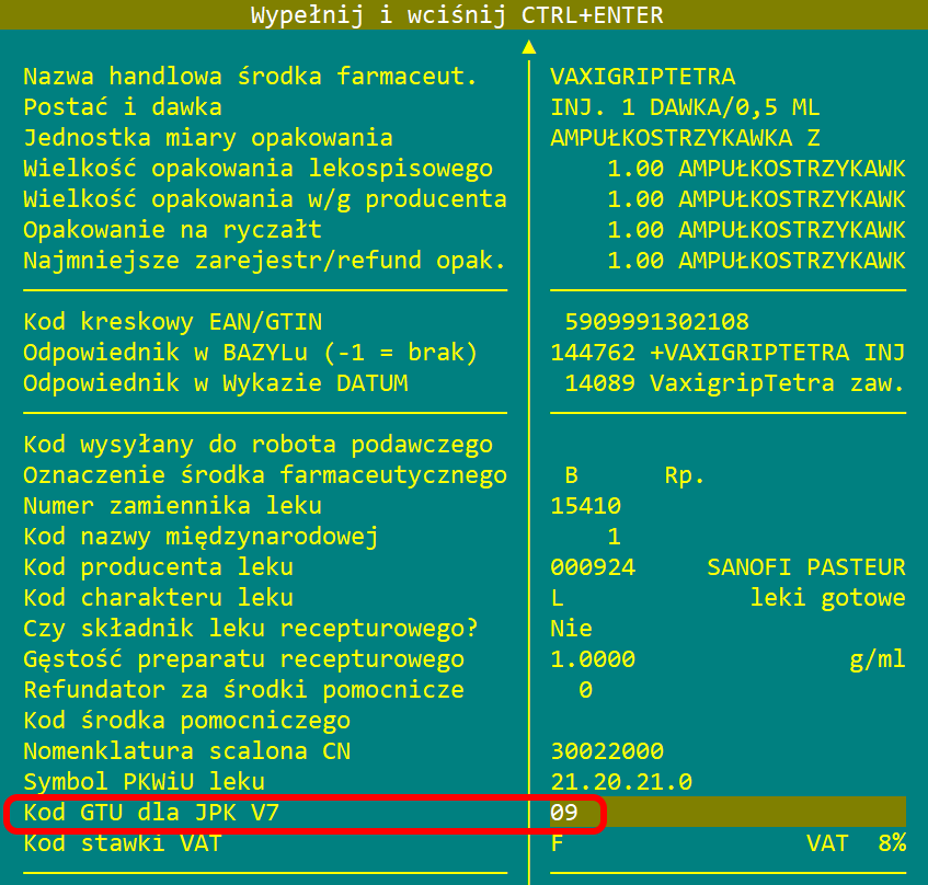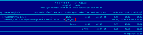 Kod GTU dla JPK V7 jest umieszczany przy odpowiednich pozycjach na fakturze wystawianej przez Aptekę.