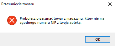 - W przypadku zakazu przesuwania pomiędzy aptekami na różnych numerach NIP, w buforze zamówienia nie będzie możliwości wskazania na liście Towar w moich aptekach apteki na innym numerze NIP. Przy próbie wskazania takiej apteki pojawi się komunikat: