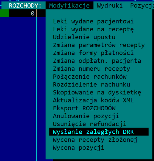 W celu wysłania zaległych dokumentów realizacji e-recept, należy po aktualizacji programu do wersji z dnia 2020.12.15 skorzystać z funkcji Rozchody > Przeglądanie starych rozchodów > Modyfikacje > Wysłanie zaległych DRR.