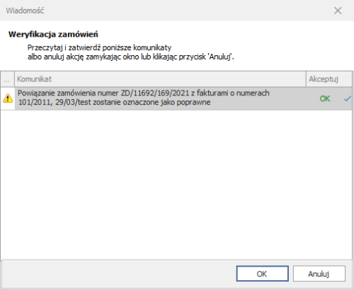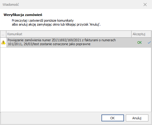 – zamówienie poprawne, status został automatycznie ustawiony na podstawie weryfikacji dokonanej przez system, gdy nie stwierdzono nieprawidłowości pomiędzy zamówieniem, a fakturą