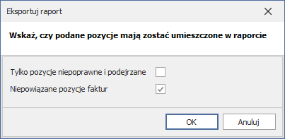 W oknie domyślnie zaznaczona jest opcja Niepowiązane pozycje faktur. Eksport raportu potwierdzamy za pomocą przycisku OK. Raport zostanie zapisany jako: Skoroszyt programu Excel (*.xlsx) lub Skoroszyt programu Excel 97-2003 (*.xls).