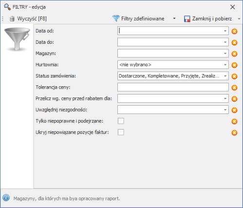 9. Ukryj niepowiązane pozycje faktur – po zaznaczeniu tego filtra, w wyniku raportu nie zostaną wyświetlone pozycje z faktur, które nie zostały powiązane z żadną pozycją z zamówienia np.: tzw. „wrzutki z hurtowni”.