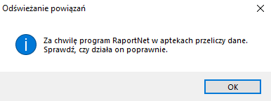 Przypominamy, że za odświeżanie powiązań odpowiada program RaportNet, dlatego upewniamy się czy program działa (wystarczy otworzyć w tym celu moduł RaportNet-> widok Aktywność RaportNet), jeśli tak to czekamy przysłowiowe „kilka minut”, aby mieć pewność, że zadanie zostało wykonane.