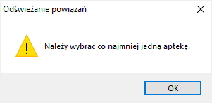 W przypadku, gdy nie zostanie wybrana żadna z widniejących na liście aptek, aplikacja poinformuje nas o tym poniższym komunikatem: