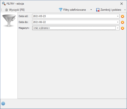 Domyślnie w filtrach ustawiony jest okres ostatnich 30 dni kalendarzowych. W filtrach należy wskazać konkretny magazyn (aptekę).