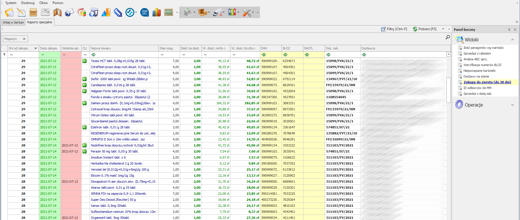 Moduł Raporty specjalne-> widok Zakupy do zwrotu (do 60 dni)