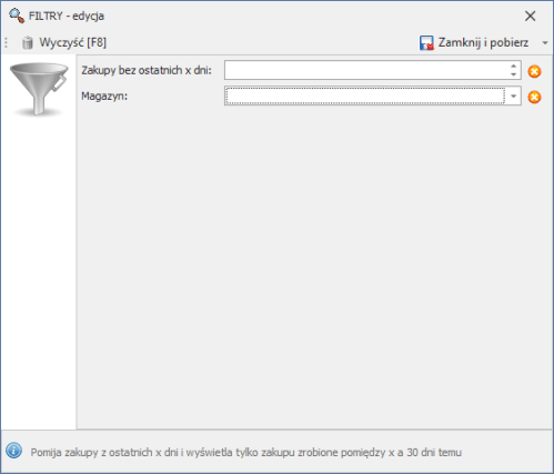 - Zakupy bez ostatnich x dni: – filtr nie uwzględnia zakupów zrobionych w ciągu ustawionej liczby dni. Dla przykładu ustawienie tutaj wartości 50 oznaczać będzie, że raport pominie zakupy z ostatnich 50 dni i skupi się na zakupach pomiędzy 50 a 60 dniem (czyli takich, które trzeba koniecznie sprawdzić zanim wygaśnie możliwość zwrotu).